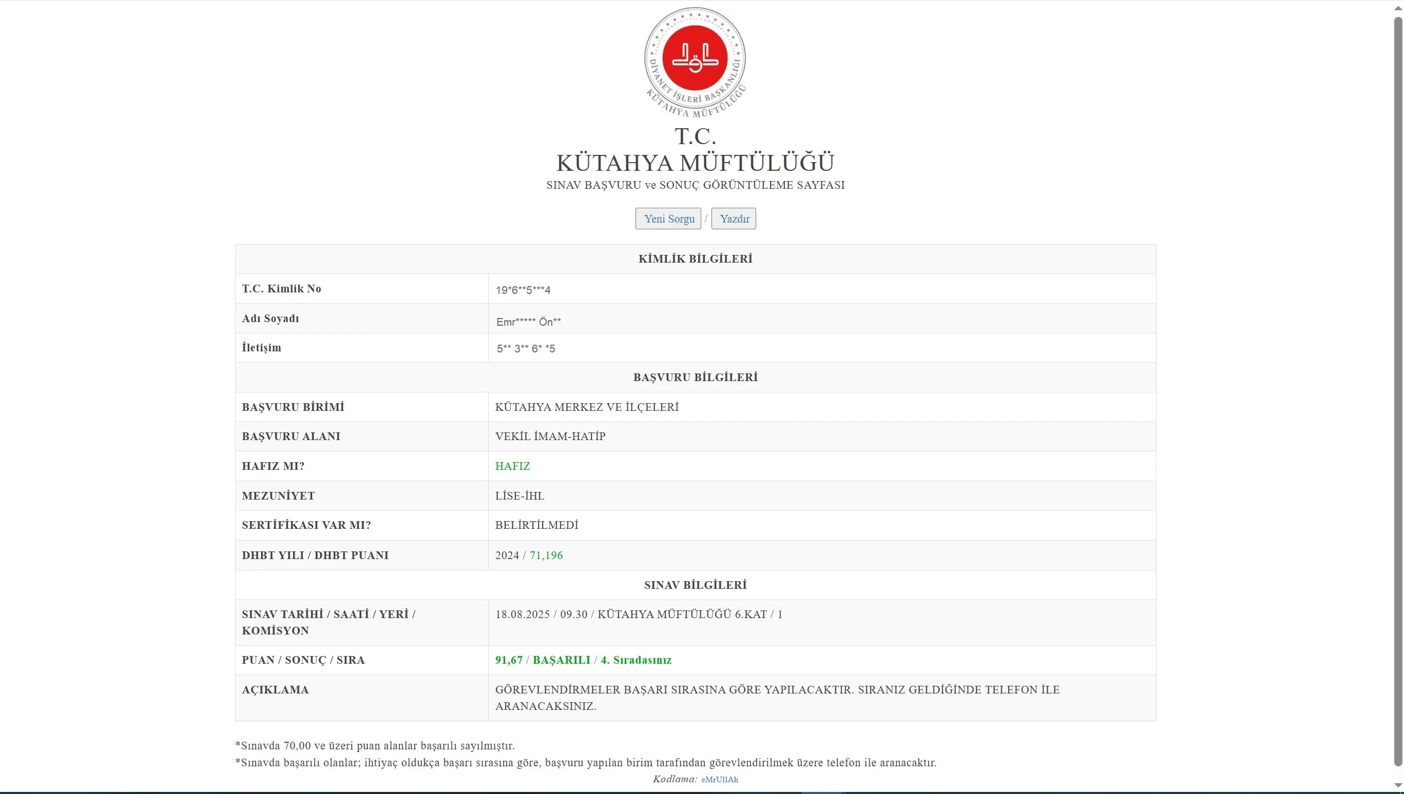 Kütahya Müftülüğünce yapılan sınav başvuru işlemleri ile sınav sonuçlarının T.C. no ile sorgulamalarının yapıldığı sınav yazılımıdır.